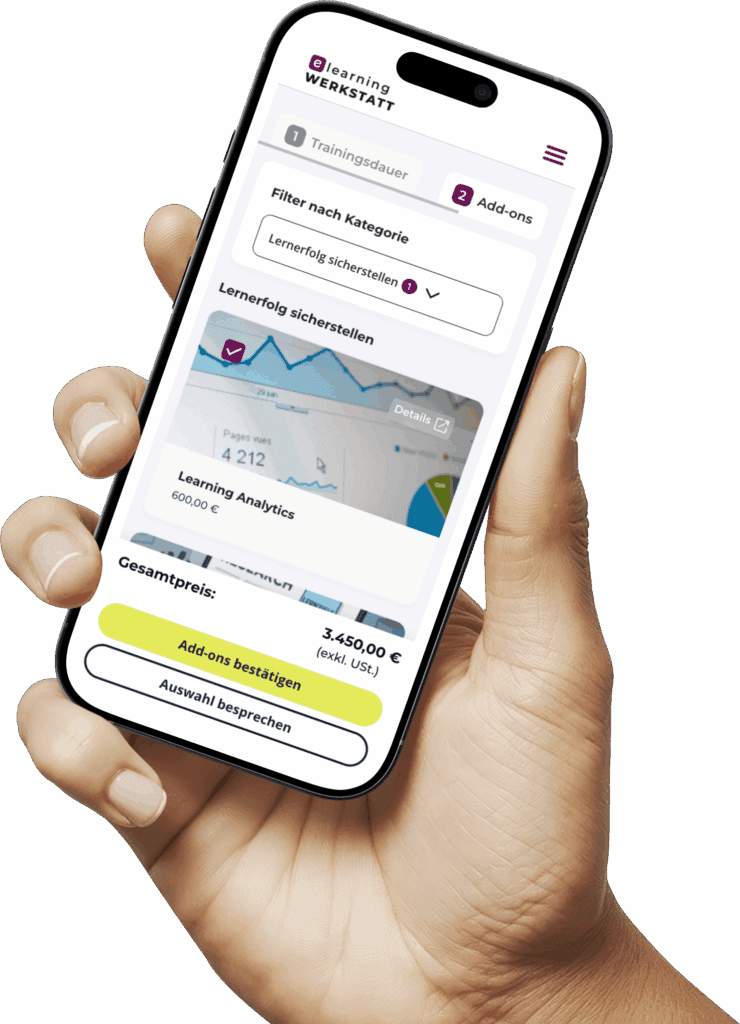 Die Kosten für die Erstellung eines maßgeschneiderten eLearning Kurses hängen von verschiedenen Faktoren ab, wie Umfang, Komplexität und gewünschten Funktionen. Wir von der eLearning Werkstatt haben uns zum Ziel gesetzt, dass die eLearning Preise für dein maßgeschneidertes Training transparent, nachvollziehbar und fair sind. Mit unseren modularen Add-ons, kannst du selbst auswählen, welche Features zu deinem eLearning Projekt und deinem Budget passen. Teste unseren eLearning Preiskalkulator und lass dir ein individuelles Angebot erstellen oder lass dich von uns persönlich beraten.